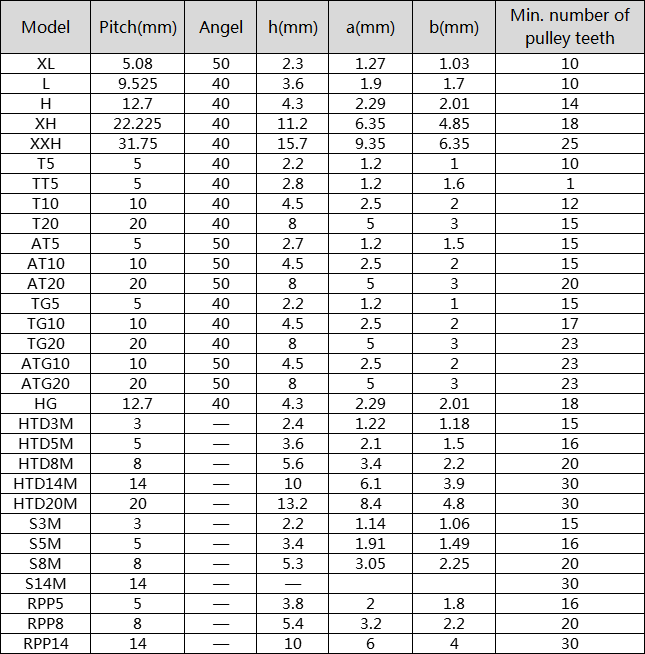 NÚMERO DE MODELO | XL, L, H, XH, XXH, T5, TT5, T10, T20, AT5, AT10, AT20, TG5, TG10, TG20, ATG5, ATG10, ATG20, HTD3M, Htd5m, htd8m, htd14m, htd20m, s3m, s5m, s8m, s14m, rpp5, rpp8, rpp14 |